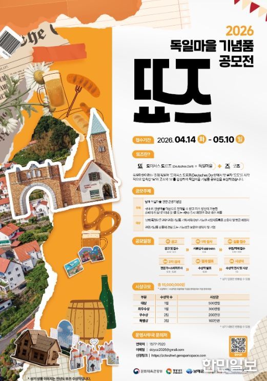 한민일보 서울포커스 김서윤 기자 | 남해군관광문화재단이 ‘2026 독일마을 기념품 공모전, 뚀즈’를 개최하기로 하고, 4월 14일부터 5월 10일 18시까지 참가 접수를 진행한다고 밝혔다.