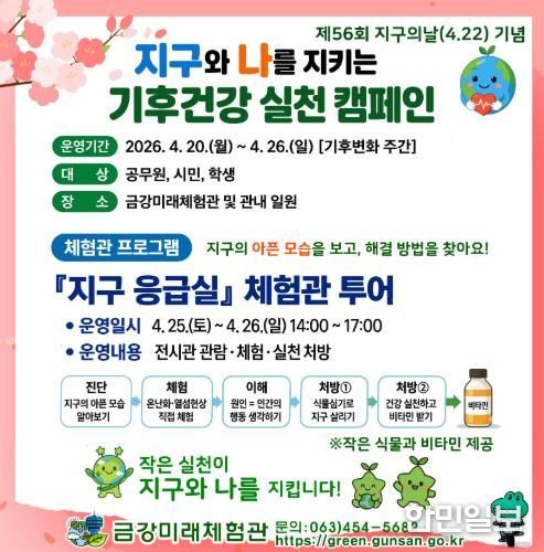 한민일보 서울포커스 김용택 기자 | 군산시는 제56회 지구의 날(4월 22일)과 기후변화주간을 맞아 시민들의 기후위기 대응 참여를 유도하기 위해 4월 20일부터 26일까지 ‘지구와 나를 지키는 기후건강 실천 캠페인’을 운영한다고 밝혔다.