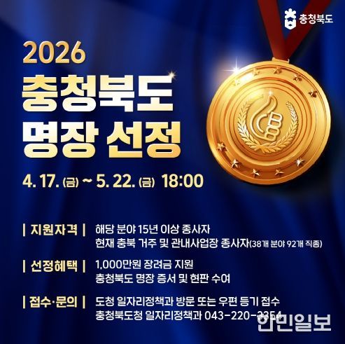 한민일보 서울포커스 임경복 기자 | 충북도는 산업현장에서 최고 수준의 숙련기술을 보유한 ‘2026년도 충청북도명장’을 선정한다고 17일 밝혔다.
