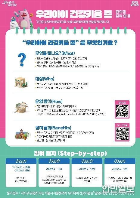 전담관리원은 점검과 함께 ’우리아이 건강키움 존‘ 포스터를 배부하는 등 사업 참여를 적극 안내할 예정이다. 참여를 신청한 업소에는 서울시와 계약한 전문업체가 방문해 건강식품 우선 진열과 표지물 설치를 지원한다.