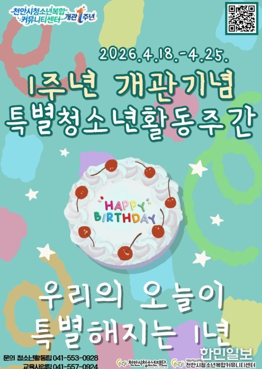 한민일보 서울포커스 황준형 기자 | 천안시청소년재단 산하 천안시청소년복합커뮤니티센터는 개관 1주년을 맞아 오는 18일부터 25일까지 ‘특별청소년활동체험주간’을 운영한다고 17일 밝혔다.