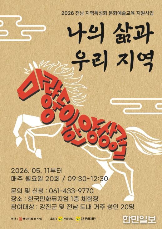 한민일보 서울포커스 임경복 기자 | 강진군 대구면에 있는 한국민화뮤지엄이 ‘2026 지역특성화 문화예술교육 지원사업’ 선정에 따라 오는 5월 11일부터 ‘나의 삶과 우리 지역–마량둥이의 한양 상경기’ 프로그램 운영을 시작하며 참가자를 모집한다.