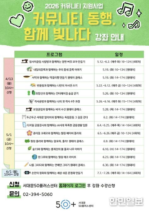 한민일보 서울포커스 김서윤 기자 | 서대문구가 운영하는 서대문50플러스센터가 중장년의 자기 계발과 사회참여를 지원하는 교육 프로그램 ‘커뮤니티 동행, 함께 빛나다’를 센터 내 강의실과 야외 현장에서 5∼7월 운영한다.