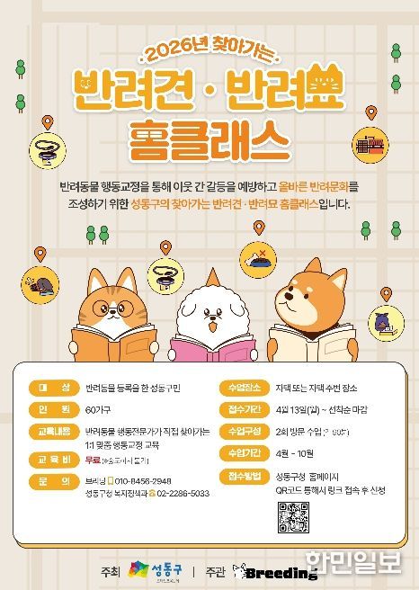 올해 교육은 성동구 내 반려동물 등록 가구를 대상으로 총 60가구를 선착순 모집한다. 교육 신청은 4월 13일부터 성동구청 누리집(홈페이지) 새소식 또는 안내문에 게시된 정보무늬(QR코드)를 통해 접수하고 있으며, 전화로도 신청이 가능하다. 교육 관련 자세한 사항은 구청 복지정책과로 문의하면 된다.