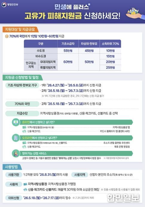 이번 고유가 피해 지원금은 대상별로 차등 지원되는 방식으로, 기초생활수급자에게는 60만 원, 차상위계층과 한부모가정에는 50만 원, 소득 하위 70% 대상자에게는 20만 원이 각각 지급된다.