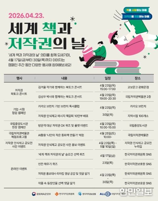 한민일보 서울포커스 박용남 기자 | 문화체육관광부는 한국저작권위원회, 한국저작권보호원과 함께 ‘세계 책과 저작권의 날’을 맞이해 4월 17일부터 30일까지 ‘저작권 보호 캠페인’을 추진한다. 이를 통해 책과 저작권이 지닌 소중한 가치를 되새기고, 창작자의 권리를 존중하는 문화를 국민 일상에 확산할 계획이다.
