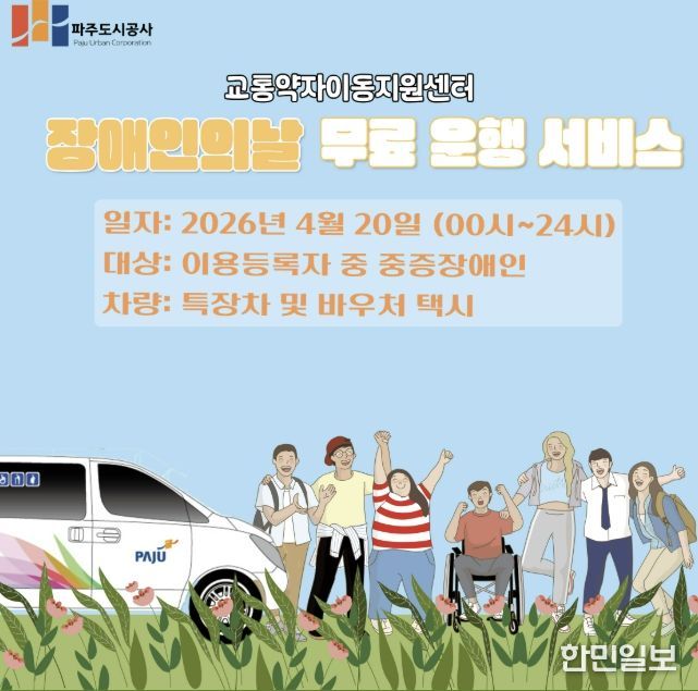 한민일보 서울포커스 진광성 기자 | 파주도시공사 교통약자이동지원센터에서는 오는 4월 20일 장애인의 날을 맞아 교통약자를 위한 무료 운행 서비스를 실시한다.