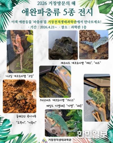 한민일보 서울포커스 김서윤 기자 | 거창군은 거창천적생태과학관에서 2026년 ‘거창방문의 해’를 맞아 오는 21일부터 어린이와 학생, 가족 관람객을 대상으로 이색 애완 파충류 전시를 개최한다고 밝혔다.