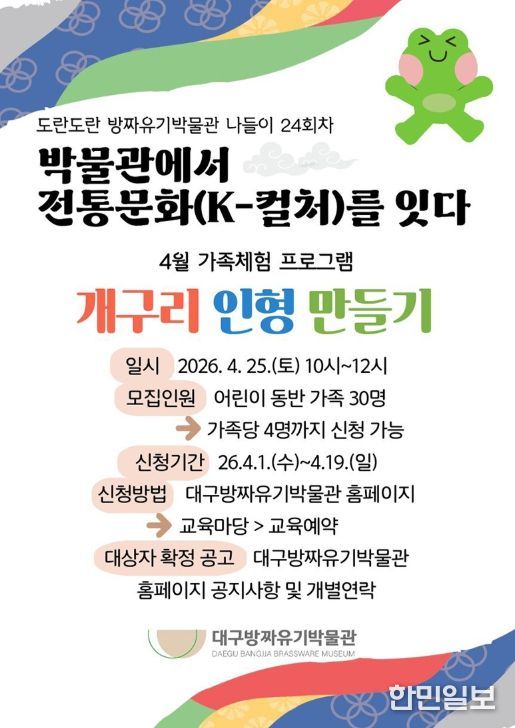 한민일보 서울포커스 김봉순 기자 | 대구문화예술진흥원 박물관운영본부 소속 대구방짜유기박물관은 화창한 봄날 4월에 전통공예 가족체험과 팔공산 역사문화 이해 특강을 기획하여, 4월 25일 오전 10시에 ‘개구리 인형 만들기’ 체험을, 4월 28일 오후 2시에 ‘고려 태조 왕건 후백제 견훤과 팔공산’ 강의를 개최한다.