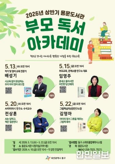 한민일보 서울포커스 임경복 기자 | 대전 동구는 자녀교육에 관심 있는 부모를 대상으로 전문가 초청 강연 프로그램인 2026년 상반기 ‘부모 독서 아카데미’를 운영한다고 17일 밝혔다.