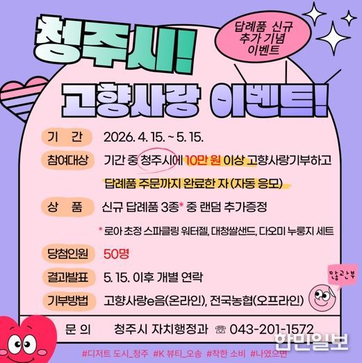 한민일보 서울포커스 김다남 기자 | 청주시는 고향사랑기부제 답례품 신규 추가를 기념해 기부 참여자를 대상으로 ‘답례품 추가 증정 이벤트’를 진행한다고 18일 밝혔다.