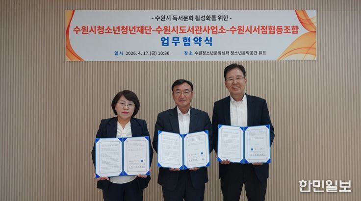 한민일보 서울포커스 진광성 기자 | 수원시청소년청년재단은 수원시도서관사업소, 수원시서점협동조합과 4월 17일 수원청소년문화센터에서 수원시 독서문화 활성화를 위한 업무협약을 체결했다.