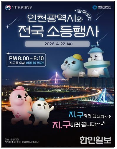 지구의 날 당일인 22일 오후 8시에는 이번 주간의 하이라이트인‘전국 소등 행사’가 열린다. 시청을 비롯한 공공기관과 인천대교, 송도 센트럴파크 등 지역 랜드마크는 물론, 주요 아파트 단지 등 민간 영역까지 참여해 10분간 불을 끄고 지구를 위한 휴식의 시간을 갖는다.