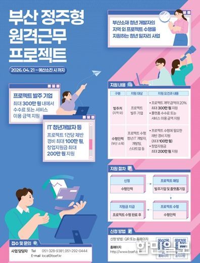 한민일보 서울포커스 임광현 기자 | 부산시는 지역 청년 아이티(IT) 인력이 부산에 거주하면서 국내외 기업의 프로젝트를 수행할 수 있도록 지원하는 '부산형 마이크로 일자리 기반 정주형 원격근무 프로젝트' 사업을 전국 최초로 올해 시범 추진한다고 밝혔다.