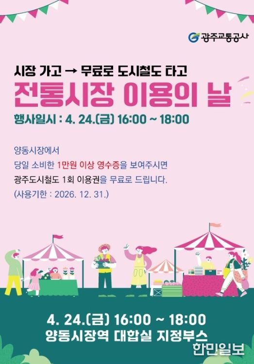 한민일보 서울포커스 임경복 기자 | 광주교통공사가 지역 골목상권 활성화와 대중교통 이용 문화 확산을 위해 ‘전통시장 이용의 날’ 행사를 운영한다.