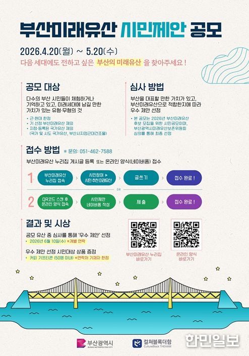 접수는 부산미래유산 누리집에서 게시글을 작성하거나, 큐알(QR)코드 온라인 양식을 통해 할 수 있으며, 우수 제안자에게는 커피 기프티콘(50명 이내)을 제공할 예정이다.