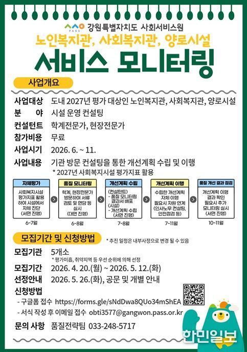 한민일보 서울포커스 곽중희 기자 | 강원특별자치도 사회서비스원은 도내 사회복지시설의 서비스 품질 향상과 사회서비스 품질 표준화 체계 구축을 위해 오는 6월부터 ‘서비스 모니터링’ 사업을 추진한다.