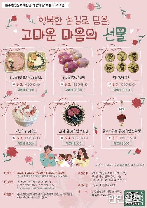 한민일보 서울포커스 유돈상 기자 | 홍성군 홍주천년문화체험관은 가정의 달을 맞아 오는 5월 2일부터 3일까지 이틀간 특별 프로그램 “행복한 손길로 담은 고마운 마음의 선물”을 운영한다.