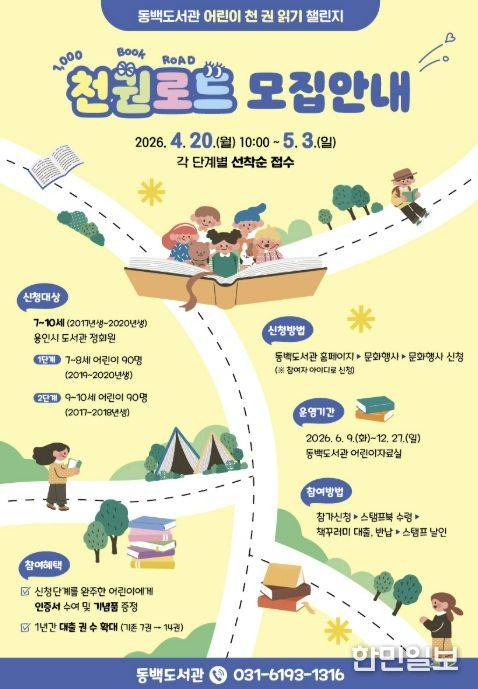 한민일보 서울포커스 김성윤 기자 | 용인특례시 동백도서관은 어린이 천 권 읽기 챌린지 ‘천권로드(ROAD)’ 참여자를 모집한다고 20일 밝혔다.