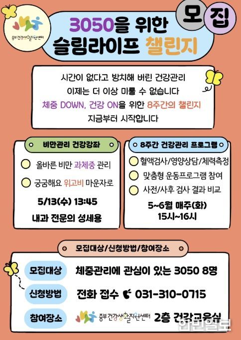 한민일보 서울포커스 유현민 기자 | 시흥시 중부건강생활지원센터는 비만 위험 요인이 있는 30~50대 성인을 대상으로 건강한 생활 습관 형성과 만성질환 예방을 위한 ‘슬림라이프 챌린지’를 운영하며 참여자를 모집한다.