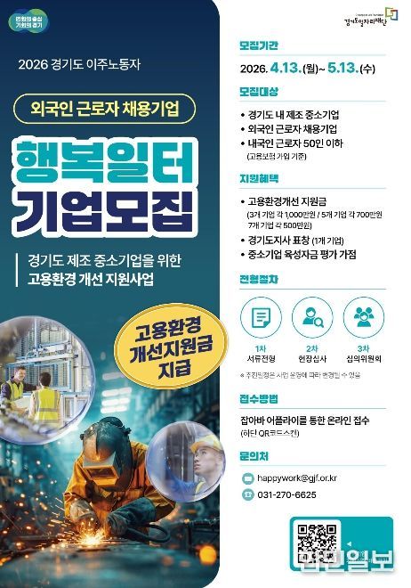 한민일보 서울포커스 김윤이 기자 | 경기도와 경기도일자리재단은 도내 외국인 근로자를 고용한 중소 제조기업을 대상으로 ‘2026년 경기도 이주노동자 행복일터 선정사업’ 참여기업을 모집한다고 20일 밝혔다.