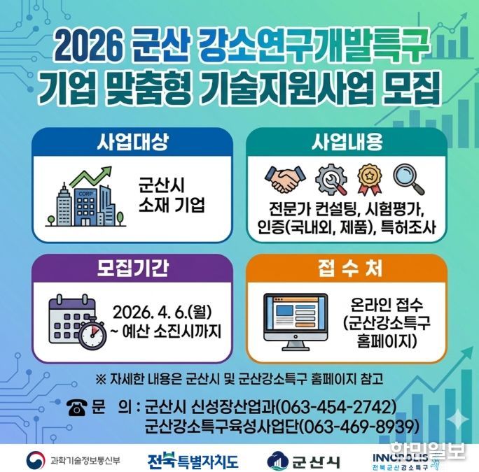 한민일보 서울포커스 김용택 기자 | 군산시는 관내 기업의 기술 경쟁력 강화를 위해 ‘2026년 군산 강소연구개발특구 기업 성장단계별 기술지원사업’을 본격 추진한다고 밝혔다.
