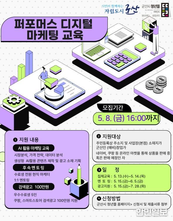 한민일보 서울포커스 김용택 기자 | 군산시 청년뜰 창업센터가 4월 20일부터 5월 8일까지 지역 온라인 창업가의 디지털 마케팅 역량 강화를 위한 '2026년 퍼포먼스 디지털 마케팅 교육' 참여자를 모집한다.