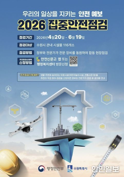 한민일보 서울포커스 진광성 기자 | 수원특례시가 안전사고를 예방하고, 시민의 안전 의식을 고취하기 위해 20일부터 6월 19일까지 ‘2026년 집중안전점검’을 한다.