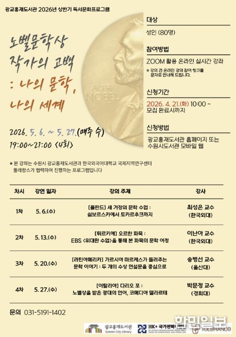 한민일보 서울포커스 진광성 기자 | 수원시 광교홍재도서관이 한국외국어대학교와 협력해 진행하는 2026년 세계문화기행 시리즈 1편 ‘노벨문학상 작가의 고백 : 나의 문학, 나의 세계’ 강좌를 수강할 시민을 모집한다.