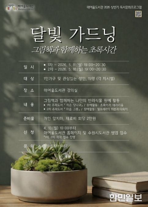 한민일보 서울포커스 진광성 기자 | 수원시 매여울도서관이 그림책 읽기와 식물 가드닝을 결합한 체험형 프로그램 ‘달빛 가드닝, 그림책과 함께하는 초록시간’을 운영한다.