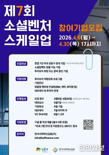 한민일보 서울포커스 임광현 기자 | 서울 성동구는 관내 소셜벤처기업을 대상으로 투자 유치 역량 강화를 위해 2026년 제7회 소셜벤처 스케일업 프로그램 참여기업을 모집한다고 밝혔다.