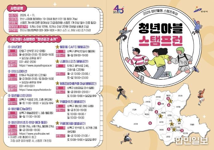 한편 ‘청년마블 스탬프런’ 사업에 대한 자세한 사항은 안산시청 누리집에서 확인할 수 있으며, 스탬프북은 관내 청년공간과 각종 청년 행사·축제 현장에서 받을 수 있다.