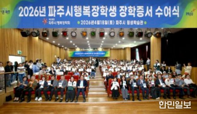 한민일보 서울포커스 진광성 기자 | 파주시는 (재)파주시행복장학회가 지난 18일 파주시 평생학습관 대공연장에서 학부모와 장학생 등 200여 명이 참석한 가운데 2026년 장학증서 수여식을 개최했다고 밝혔다.