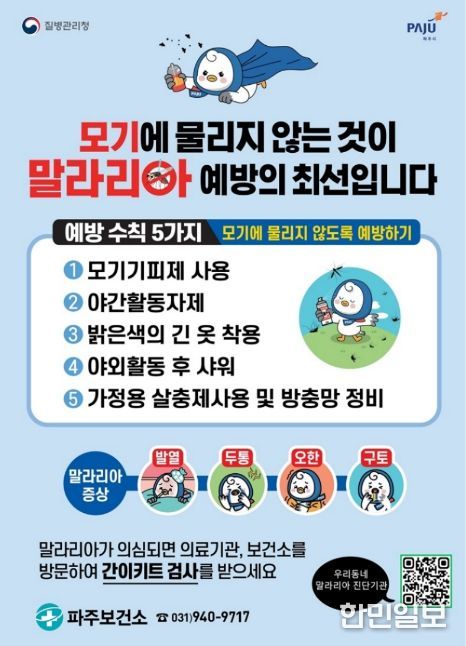 이한상 파주보건소장은 “발열이나 오한 등 감기 증상이 나타날 경우, 가까운 말라리아 진단기관이나 보건소를 방문해 신속히 검사받는 것이 중요하다”라며 “앞으로도 촘촘한 감염병 안전망을 구축해 시민의 건강과 일상을 안전하게 지켜나가겠다”라고 강조했다.