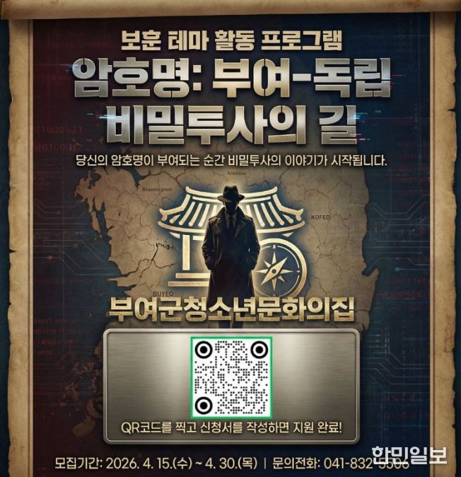 한민일보 서울포커스 유돈상 기자 | 부여군시설관리공단 청소년문화의집은 국가보훈부 공모사업에 선정된 2026년 보훈 테마 활동 프로그램 '암호명 부여-독립 비밀투사의 길'에 참여할 청소년을 4월 30일까지 모집한다.