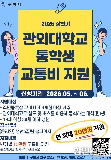 한민일보 서울포커스 김봉순 기자 | 구미시가 관외 대학(원)생의 통학 부담을 줄이기 위해 교통비 지원 방식을 대폭 손질했다. 실비 정산을 폐지하고 연 최대 20만원 정액 지원으로 전환하는 한편, 증빙 절차를 간소화해 청년 체감도를 높인 것이 핵심이다.