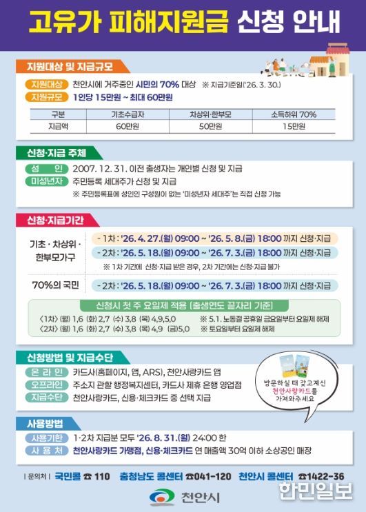 김석필 천안시장 권한대행 부시장은 “고유가로 힘든 시기를 보내는 시민들에게 이번 지원금이 실질적인 버팀목이 되길 바란다”며 “대상별 신청 기간이 다른 만큼 시민들이 혼선을 겪지 않도록 홍보와 행정 지원에 총력을 기울이겠다”고 말했다.