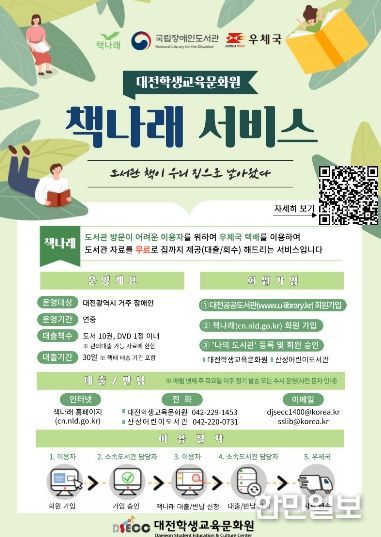 한민일보 서울포커스 유한희 기자 | 대전학생교육문화원은 봄철 외부 활동이 어려운 장애인과 65세 이상 어르신 등 독서 소외계층의 책 읽는 즐거움을 위해, 비대면 도서 대출 및 반납 서비스인 ‘책나래’ 사업을 4월부터 본격 추진한다고 밝혔다.