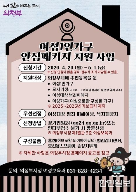 한민일보 서울포커스 심기옥 기자 | 의정부시는 4월 20일부터 5월 1일까지 12일간 온․오프라인을 통해 여성 1인 가구 안심패키지 지원사업의 신청을 접수한다.
