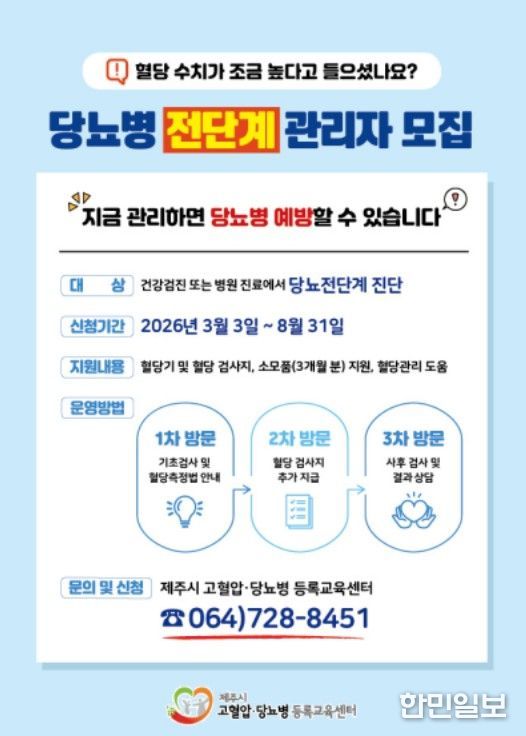 한민일보 서울포커스 김다남 기자 | 제주보건소는 시민의 만성질환 예방과 건강관리 능력 향상을 위해 ‘당뇨병 전단계 관리사업’과 ‘건강행태개선 독려사업’을 추진하고 있다.