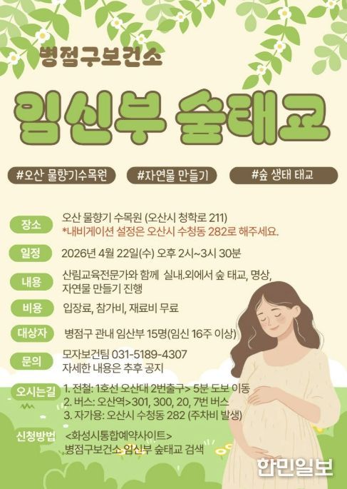 한민일보 서울포커스 진광성 기자 | 화성특례시 병점구보건소는 임신부의 정서적 안정과 건강한 출산을 지원하기 위해 오는 22일 ‘임신부 숲태교 프로그램’을 운영한다고 밝혔다.