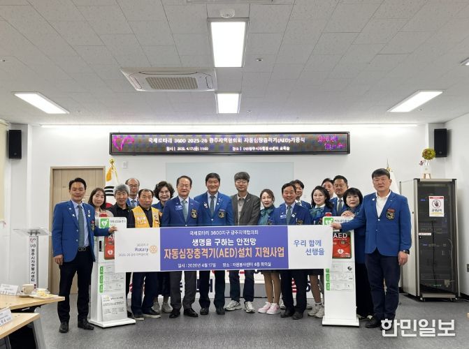 한민일보 서울포커스 임경복 기자 | 국제로타리 3600지구 2025-26 광주지역협의회는 지난 17일 광주시자원봉사센터 4층 교육장에서 자동심장충격기 기증식을 개최하고 500만 원 상당의 장비 2대를 전달했다.