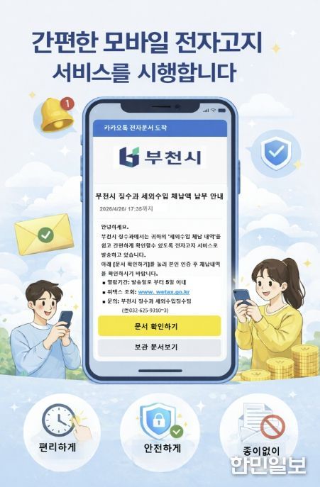 부천시 징수과장은 “모바일 전자고지 도입으로 고지서 전달의 정확성과 납부 편의가 높아질 것으로 본다”며 “앞으로도 시민 중심의 납세 서비스를 지속 확대하겠다”고 말했다.