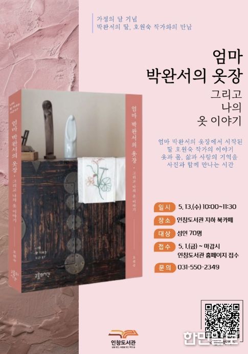 한민일보 서울포커스 임경복 기자 | 구리시립도서관은 '호원숙 작가와의 만남 ‘엄마 박완서의 옷장, 그리고 나의 이야기’' 참여 신청을 오는 5월 1일부터 접수한다고 밝혔다.