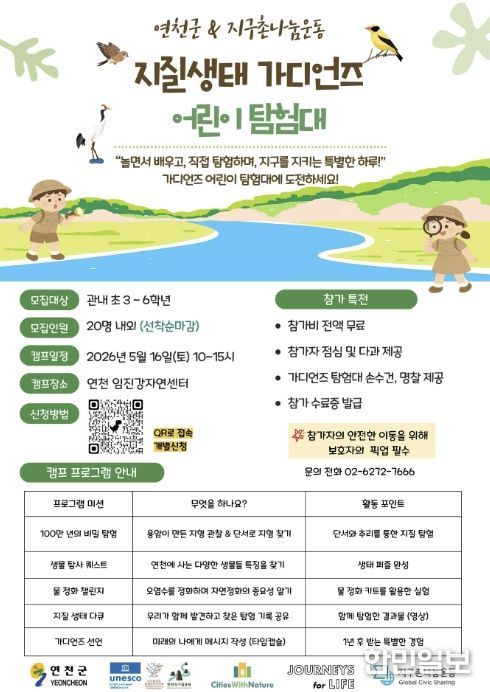 연천군이 주최하고 국제개발협력 NGO 지구촌나눔운동이 주관하는 이번 캠프는 오는 5월 16일 토요일에 진행될 예정이며, 참가 학생들이 연천의 대표적인 지질·생태 자원을 직접 탐사하고 체험하는 과정을 통해 지역의 가치를 이해하고 환경 보전의 중요성을 배울 수 있도록 마련됐다.