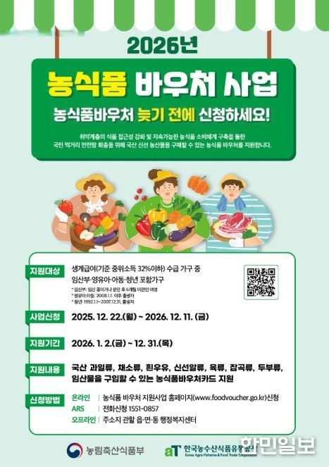 한민일보 서울포커스 김다남 기자 | 서귀포시는 취약계층의 영양 불균형 해소와 국내산 농축산물 소비 촉진을 위해 ‘2026년 농식품 바우처 지원사업’ 미신청 가구를 대상으로 신청 독려에 나선다.