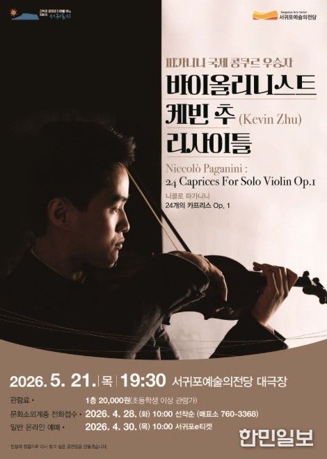 한민일보 서울포커스 김다남 기자 | 서귀포예술의전당은 세계 정상급 젊은 연주자를 소개하는 ‘2026 국제콩쿠르 위너스 콘서트 시리즈’의 첫 무대로 ‘파가니니 바이올린 콩쿠르 위너스 콘서트’를 5월 21일 저녁 7시 30분 대극장에서 개최한다.