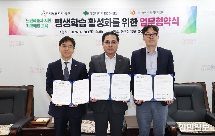 한민일보 서울포커스 임경복 기자 | 대전 동구는 20일 대전대학교 RISE사업단‧대전시치매센터와 ‘느린학습자 평생교육 지원’과 ‘치매예방 프로그램 운영’을 위한 업무협약을 체결했다고 밝혔다.
