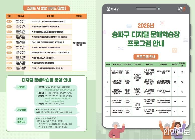 한민일보 서울포커스 박정민 기자 | 서울 송파구는 스마트폰과 AI 사용이 익숙하지 않은 주민을 위해 5월부터 ‘디지털 문해학습장’ 교육을 운영한다.