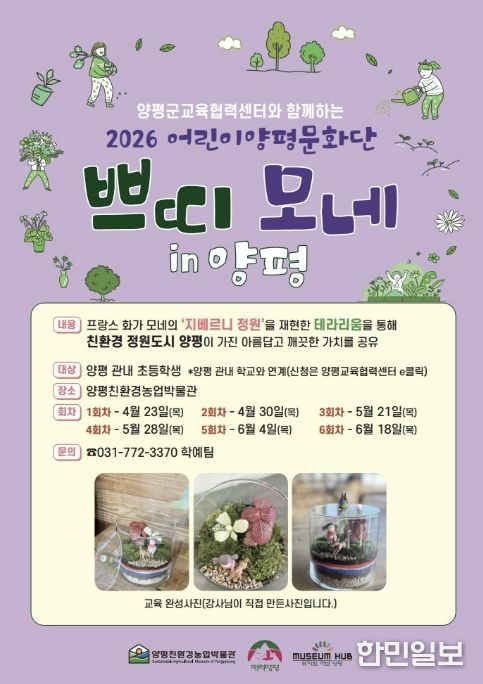 한민일보 서울포커스 차재만 기자 | 양평친환경농업박물관은 오는 4월부터 6월까지 양평 관내 초등학생을 대상으로 2026년 교육 프로그램 ‘어린이 양평문화단, 쁘띠 모네 in 양평’을 운영한다고 밝혔다.